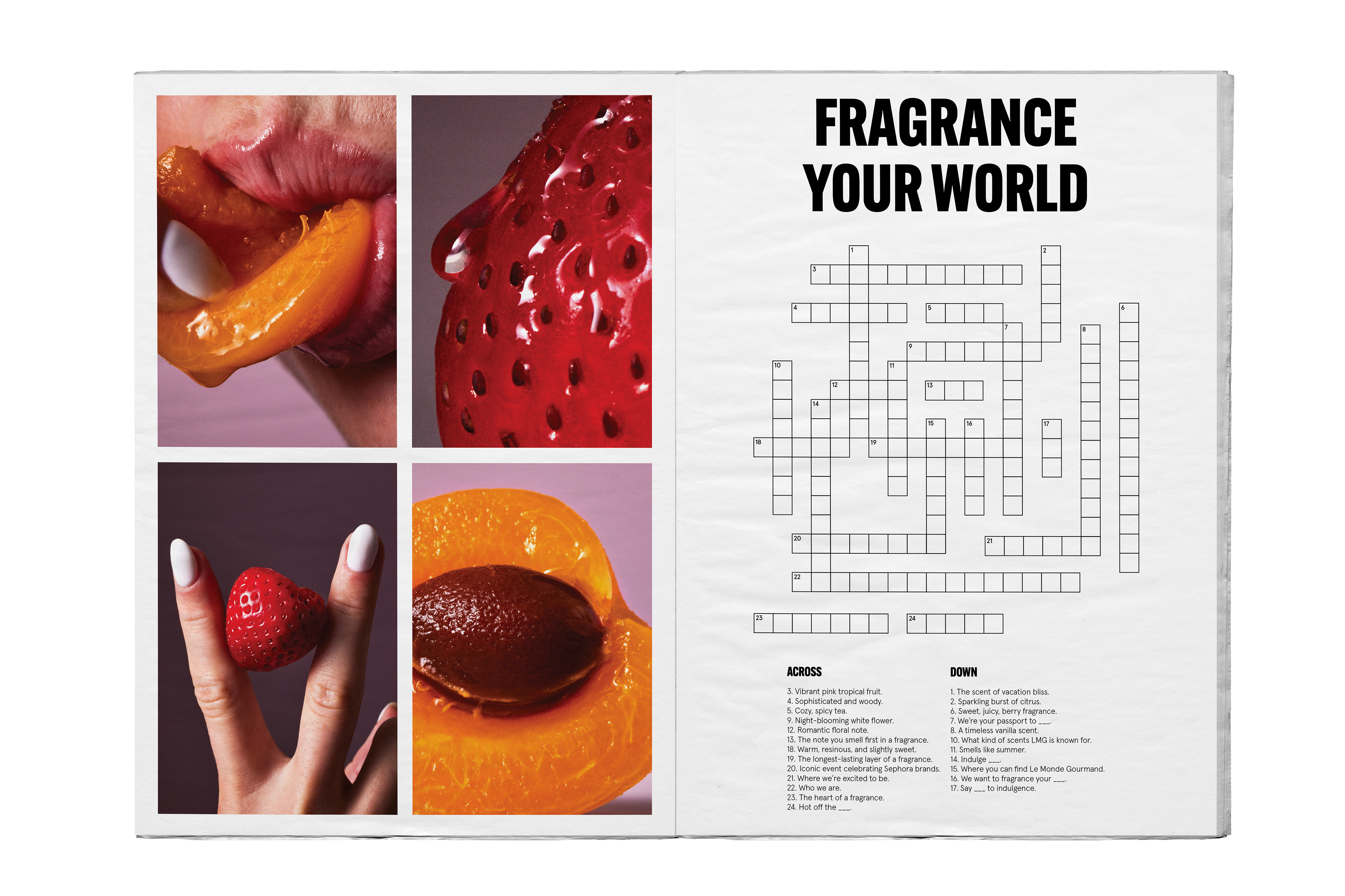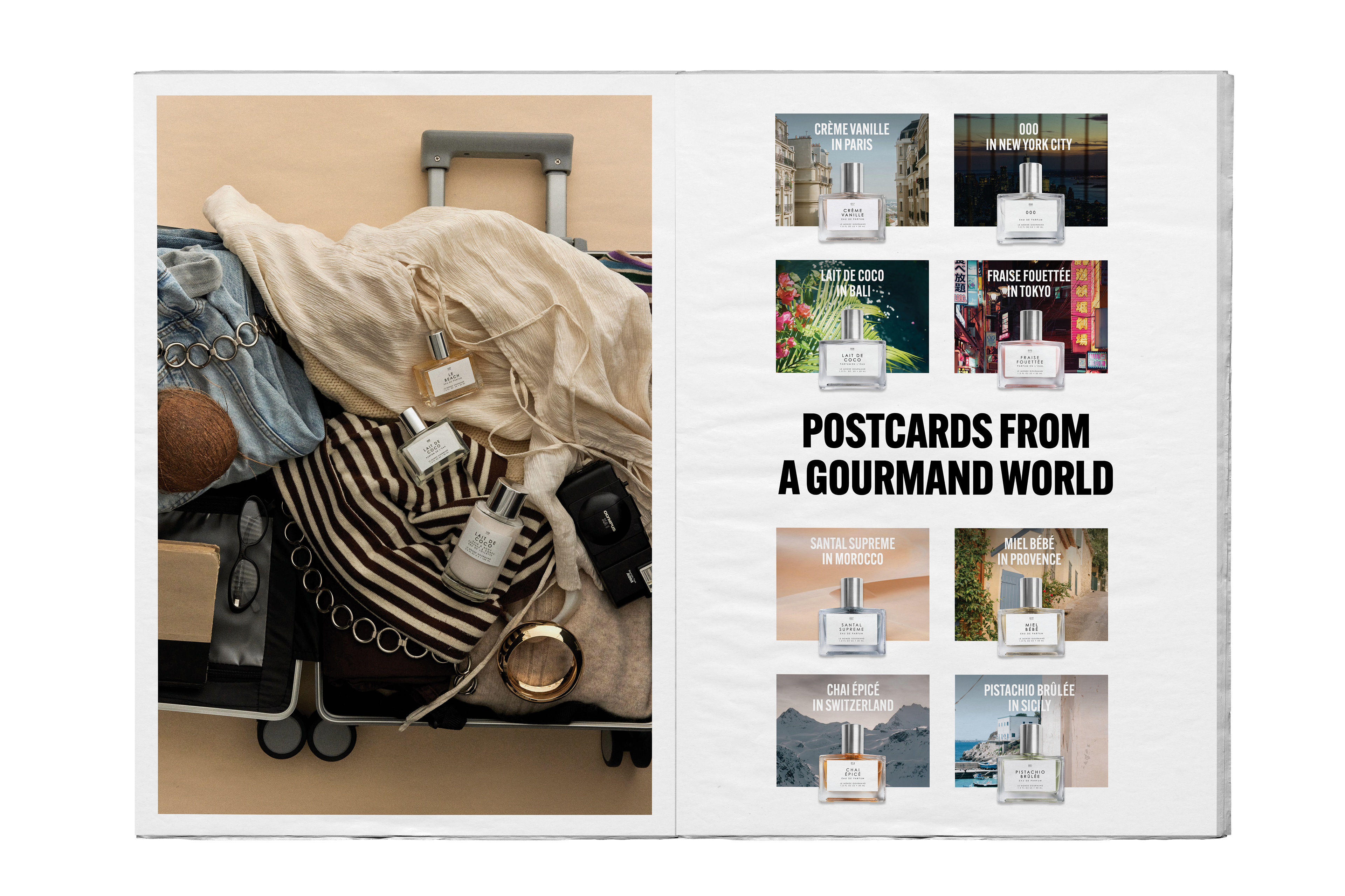As we prepared to enter this entirely new market, we also encountered unique challenges—including navigating Sephora France’s legal restrictions related to product imagery and food. This required an immediate pivot: we reshot our product photography specifically for Sephora Europe. I assisted in the art direction for this shoot, helping develop imagery that met legal requirements while still communicating a cohesive gourmand narrative. Several shots also incorporated a travel theme, reflecting our brand “packing its bags” and moving across the pond. Assets from this shoot are now used across our Sephora PDPs and featured throughout the newspaper. I even had the fun opportunity to model in several of the images.